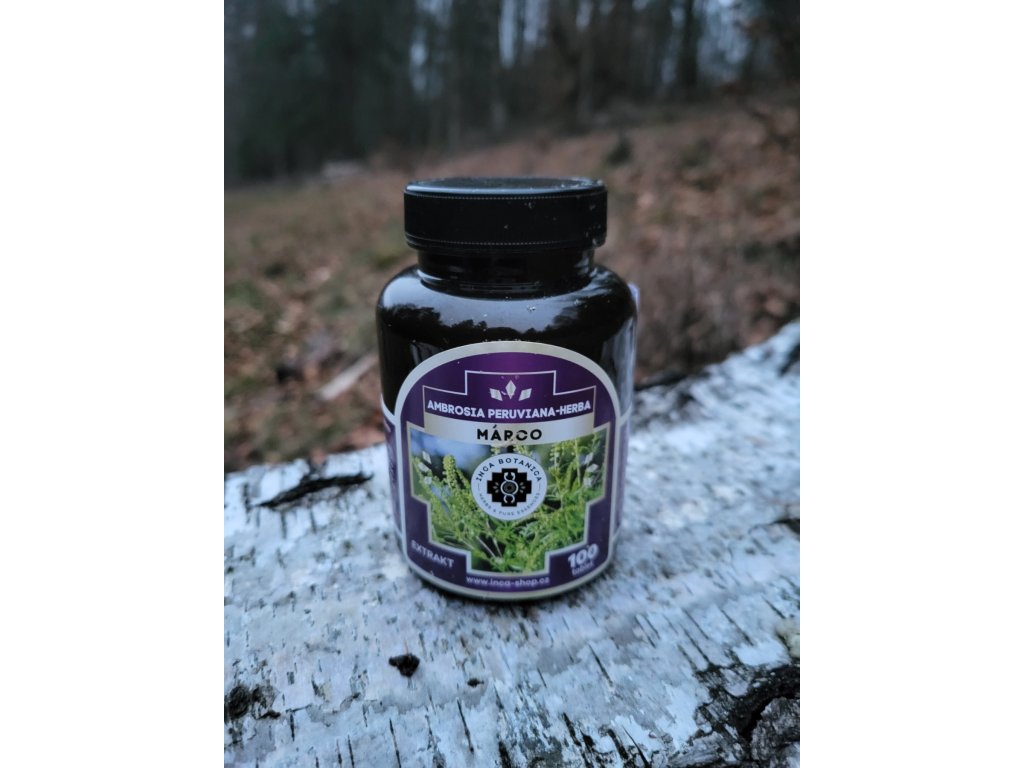 Zloženie: Marco (Ambrosia peruviana - Herba). 1 tbl. 600 mg obsahuje mikrokryštalická celulóza (plnidlo), Marco (Ambrosia peruviana-hierba) extrakt 160 mg, Hydroxypropylmetylcelulóza (stabilizátor), Stearan horečnatý rastlinný (protispekavá látka)